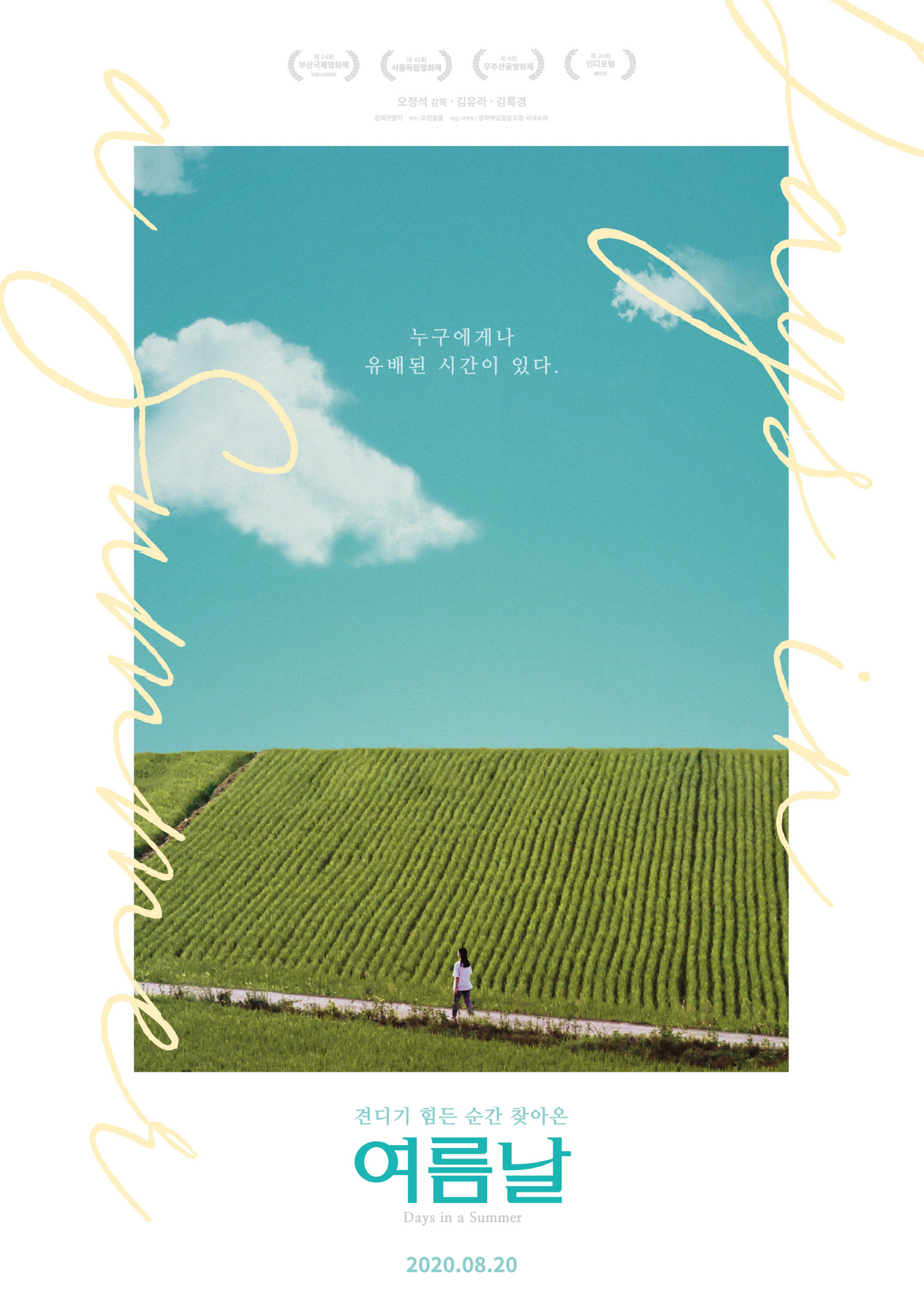 '승희'(김유라)는 서울 생활을 정리하고 엄마 고향 거제도로 내려오게 된다. 아직까지 남은 엄마의 빈자리를 보여 공허함을 느끼는 '승희'는 할머니 삼촌과 만나봐도 누구에게 딱히 의지할 곳도 없다. 그러던 '승희'에게 '거제 청년(김경록)'과 우연히 만나게 된다. 그들은 평범한 일상 속에서 자신처럼 고립되어 있는 폐왕성에 도착하고, 그곳에서 누구나 언젠가 지나쳐야만 하는 유배된 시간과 만난다. '유배'라는 키워드로 이야기를 풀어나가는 <여름날>은 나에게 다른 시선을 불러들인다. 뭔가 잘못해서 보내는 유배처럼 영화는 유배의 시간이라는 말로 영화는 궁금증을 만들어낸다. 돌아가시고 남은 시간들을 유배의 시간이라 부르는 걸까. 아니면 고통 속에 고립된 나 자신에 대한 유배인 걸까. 오정석 감독의 영화콘텐츠전문대학원 졸업 작품이자 첫 장편 연출작인 <여름날>은 오는 8월 20일 개봉할 예정이다.